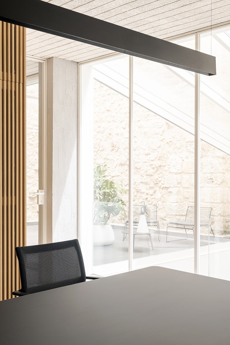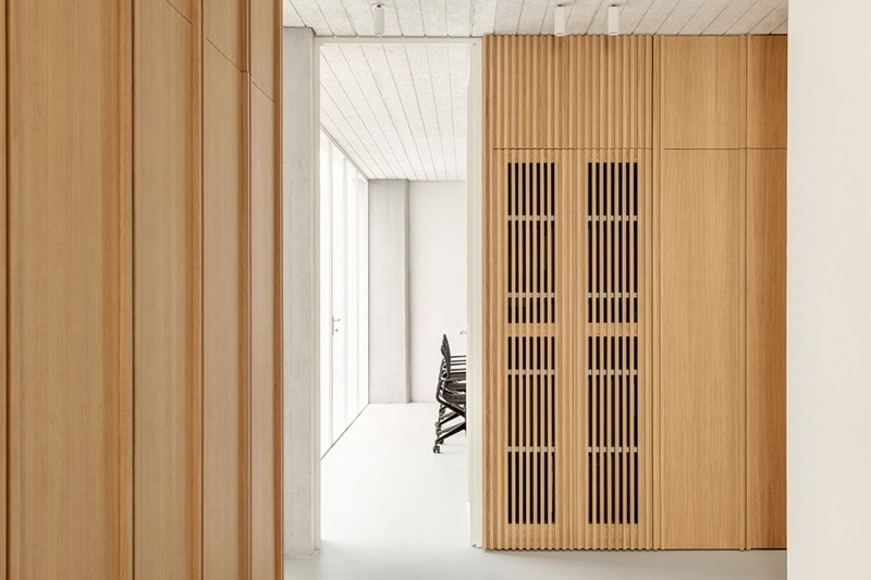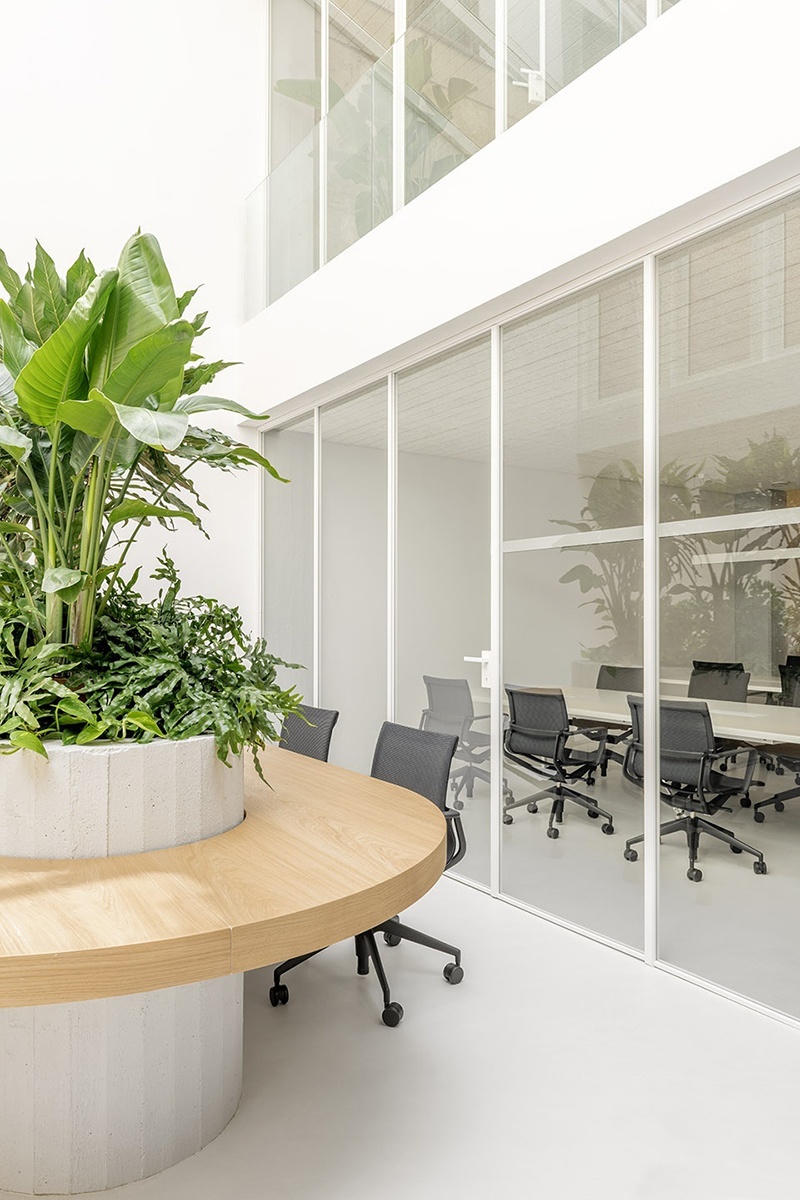 在室內(nèi),透明的玻璃隔墻占據(jù)了空間的主導(dǎo)地位,讓光線能夠在空間中無(wú)縫流動(dòng)。此外,堅(jiān)固的建筑元素本身也被巧妙地轉(zhuǎn)化為功能的容器,增強(qiáng)了空間的實(shí)用性與環(huán)境的舒適性